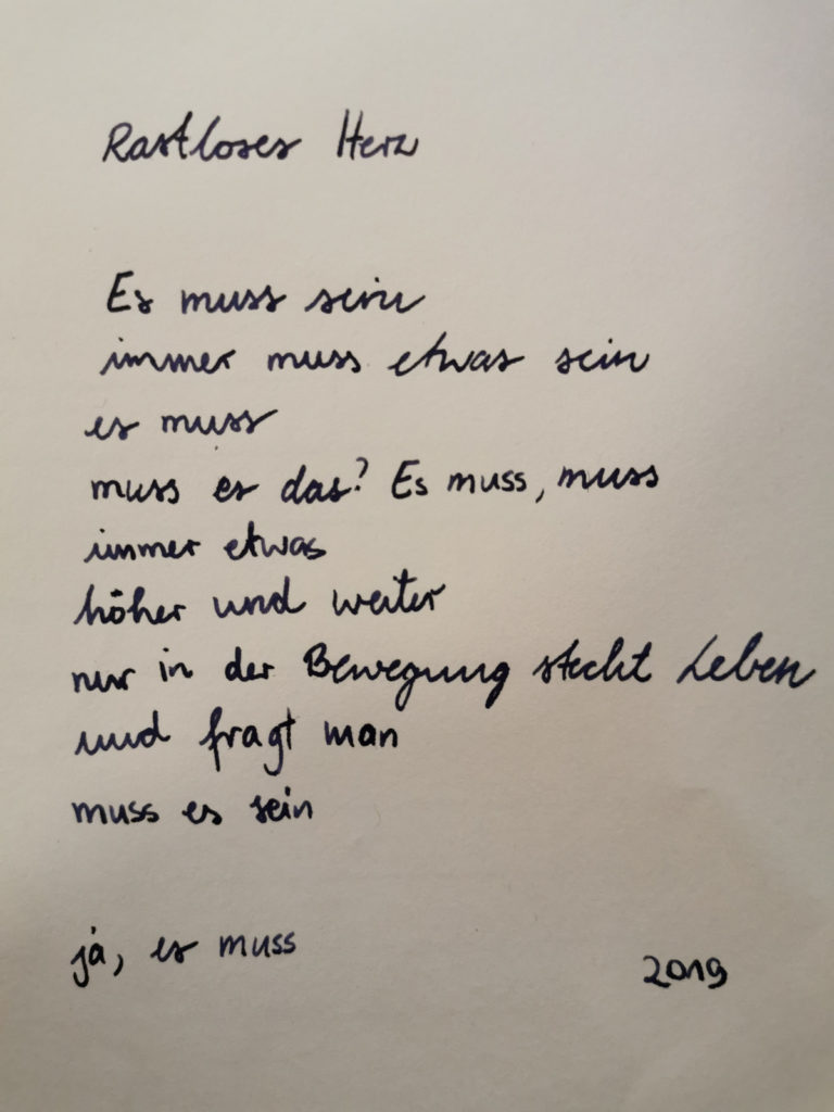 Eigenes / Gedichte Rastloses Herz 23. Januar 202223. Januar 2022 Gedicht – Lyrik Rastloses Herz Es muss sein immer muss etwas seines mussmuss es das? Es muss, mussimmer etwashöher und weiternur in der Bewegung steckt Leben und fragt man muss es sein ja, es muss 2019 Teilen mit: Klicke, um auf X zu teilen (Wird in neuem Fenster geöffnet) X Klick, um auf Facebook zu teilen (Wird in neuem Fenster geöffnet) Facebook Klicken zum Ausdrucken (Wird in neuem Fenster geöffnet) Drucken Klicken, um einem Freund einen Link per E-Mail zu senden (Wird in neuem Fenster geöffnet) E-Mail Gefällt mir:Gefällt mir Wird geladen … Ähnliche Beiträge