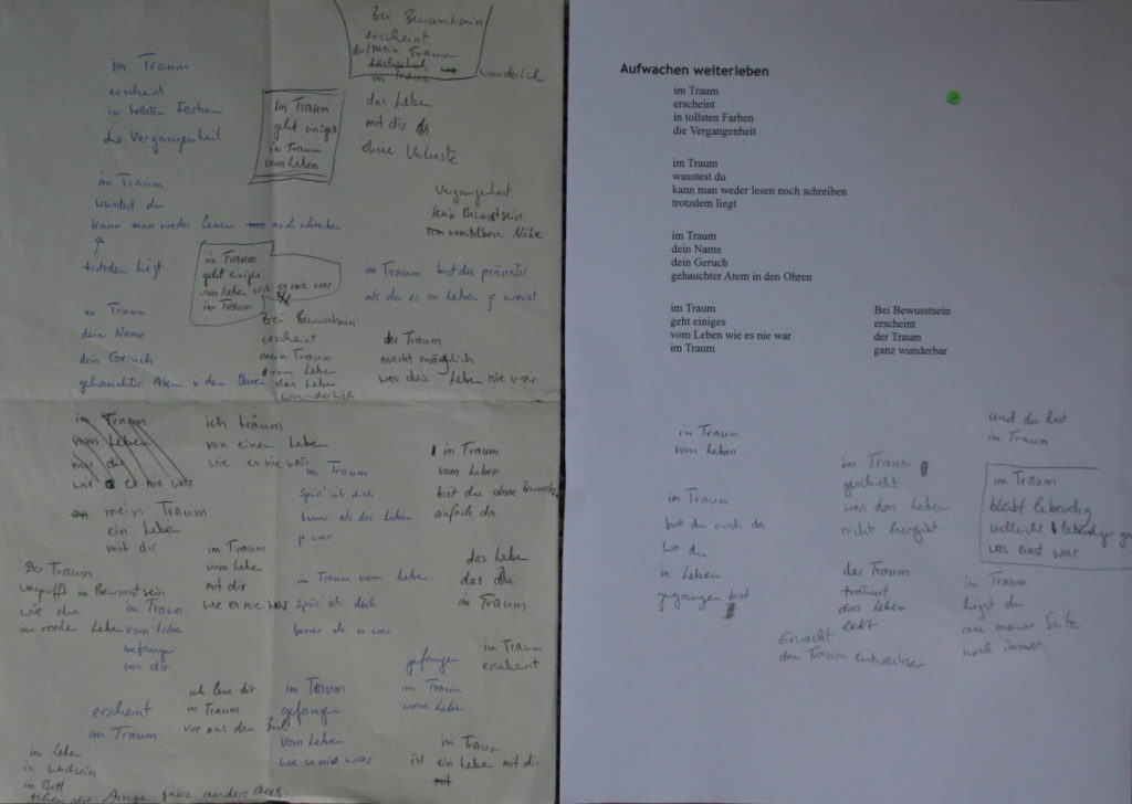 Zu diesem Gedicht habe ich handschrifltiche Notizen und eine frühere Version gefunden. Ich finde spannend, welche Wege ich gegangen bin und darum veröffentliche ich diesen Einblick in die „Werkstatt“ hier.