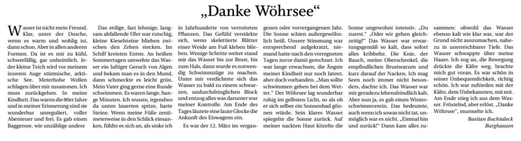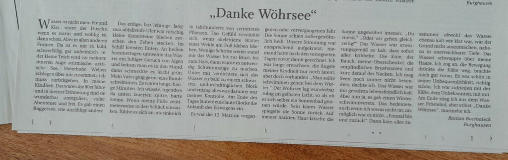 Meine Kurzstory zum Wöhrsee ist vergangenes Wochenende mit einigen anderen Geshcichten im Alt-Neuöttinger-Anzeiger erschienen. Für mich ist spannend zu sehen, wie die Geschichte wirkt, wenn sie im Zeitungssatz erscheint. Außerdem hat sie einen anderen Titel erhalten. Auch spannend.