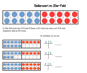 Hier gibt es den Hefteintrag Stellenwert im 20er-Feld zum Herunterladen als PDF oder als LibreOffice-Dokument. Dasselbe habe ich nochmal in schwarz-weiß als PDF oder als LibreOffice-Dokument.